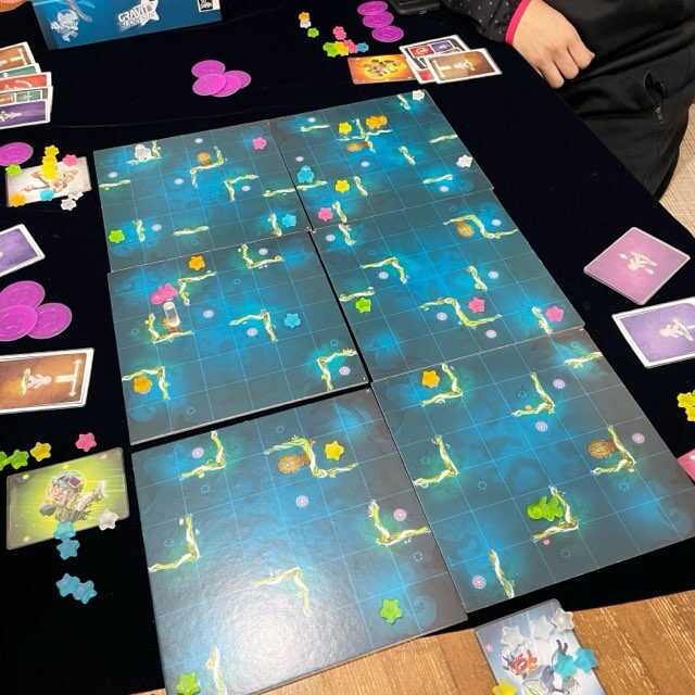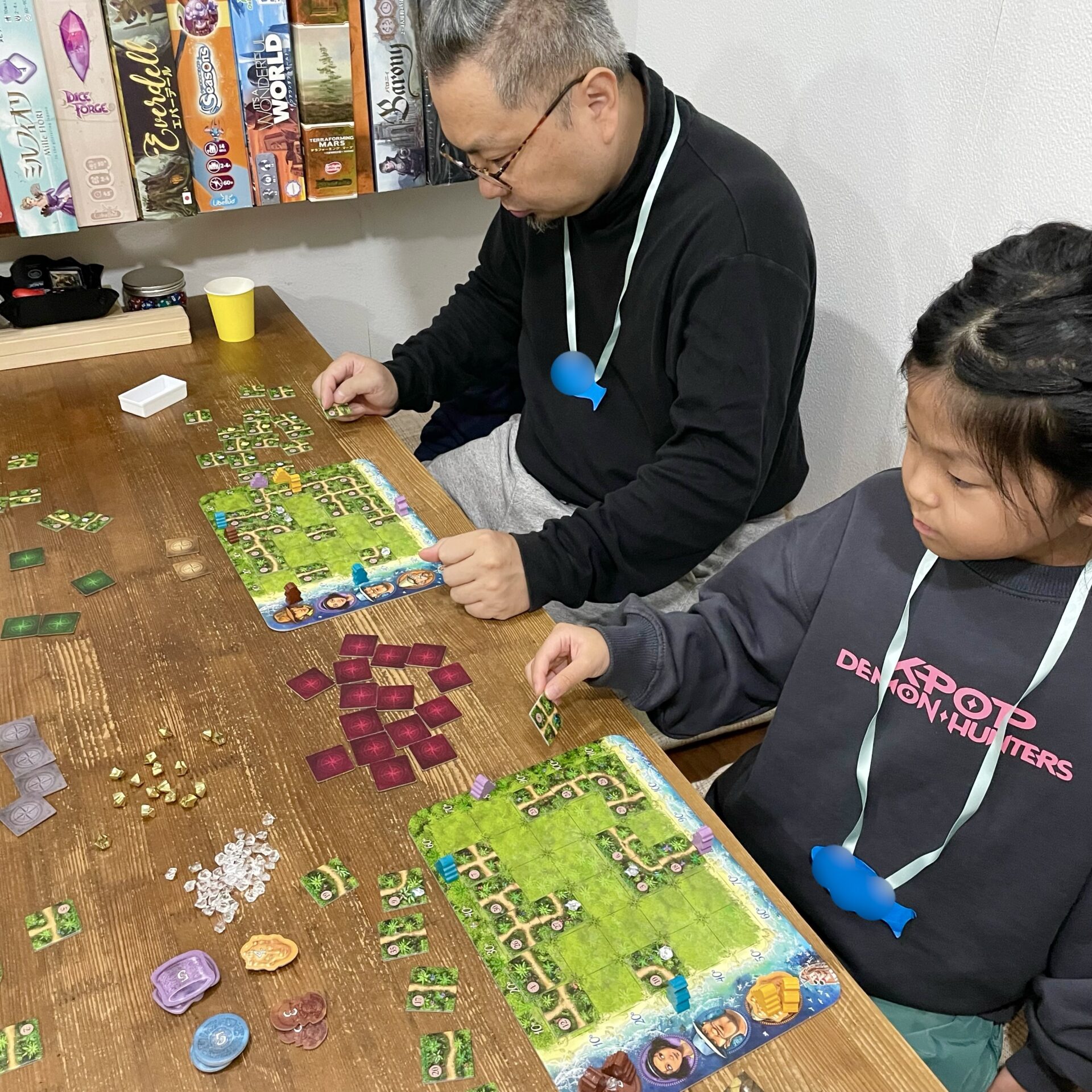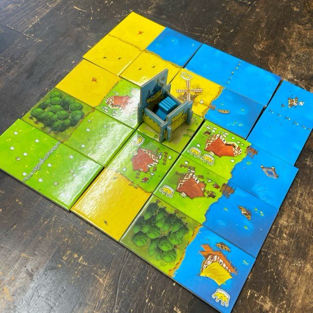 ドミノタイルを5×5で並べて、王国を作ります。早く好きなタイルを選ぶか得点化しやすいタイルを選ぶか悩ましい!